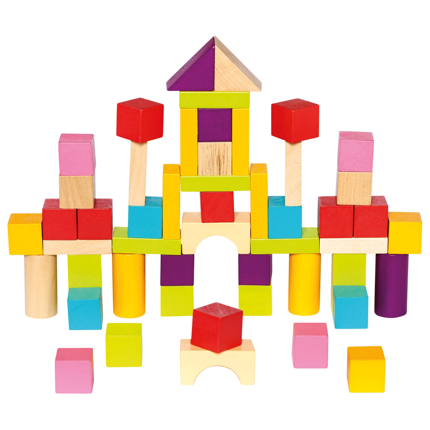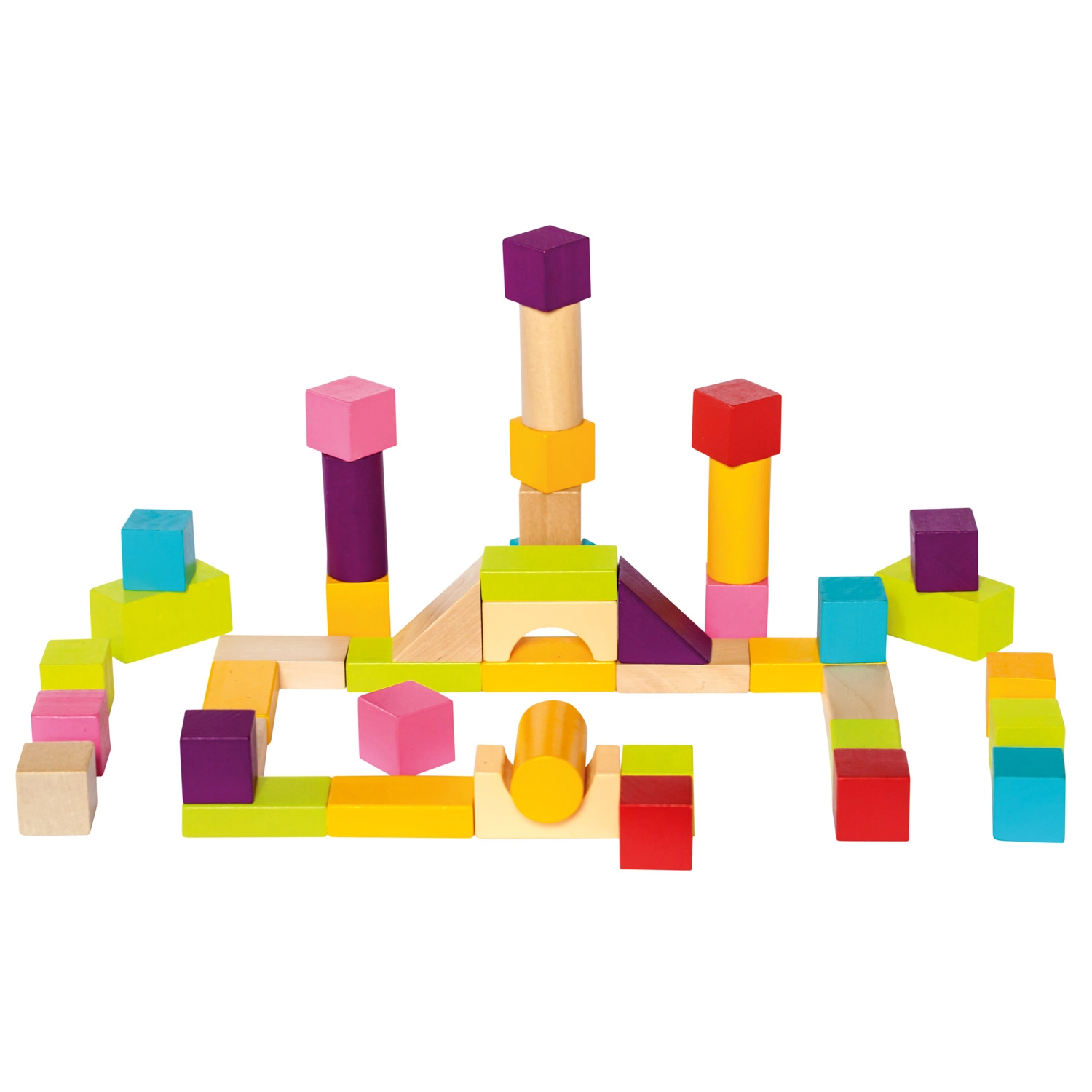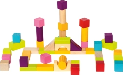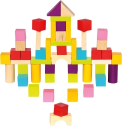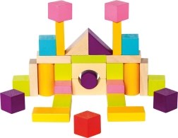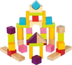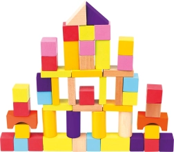 Pateicoties dažādajām formām – kluči, cilindri, loki un trīsstūri – bērni veido torņus, namiņus un fantastiskas būves. Gluds, kvalitatīvi apstrādāts koks un košas krāsas veicina sensoro attīstību un radošu spēli.
