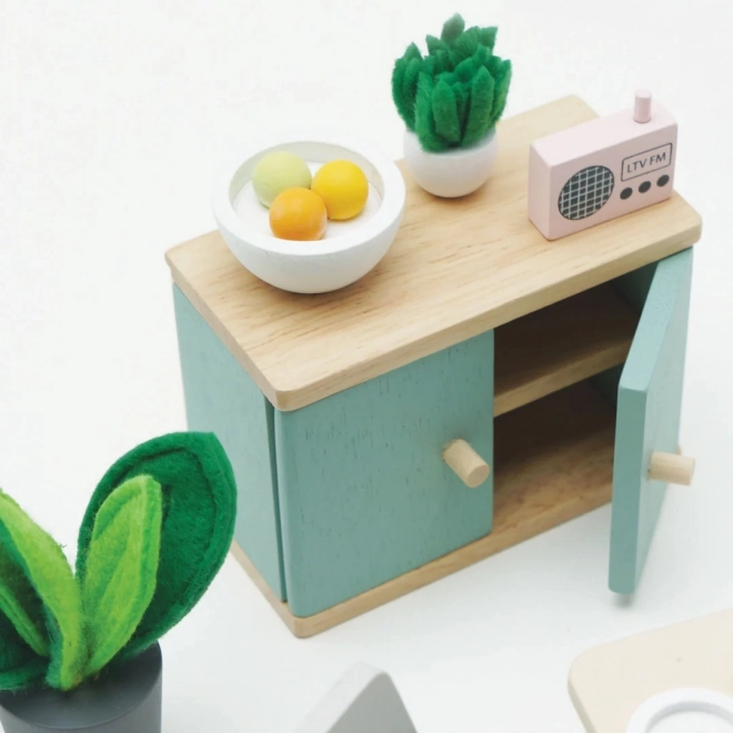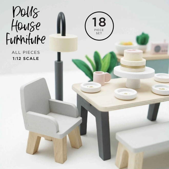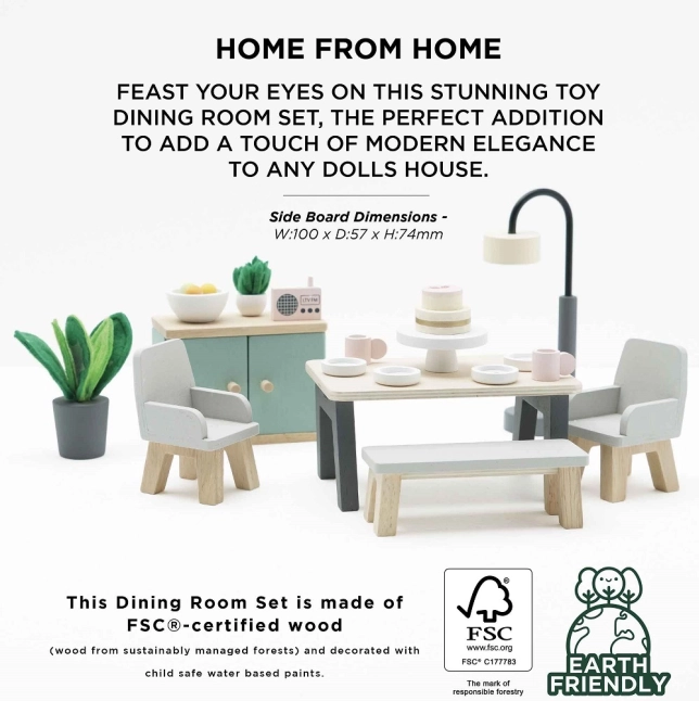Šis burvīgais ēdamistabas komplekts ir izgatavots no augstas kvalitātes FSC sertificētas koksnes un piešķir jebkurai leļļu mājiņai izsmalcinātības pieskārienu. Komplektā 18 elementi, tostarp galds, divi krēsli, sols, lampa, kumode un dekoratīvi aksesuāri, piemēram, augi, augļu trauks un torte. Komplektam ne vien ir skaists izskats, bet tas arī veicina bērnu izziņas un komunikācijas prasmes. Tas ir dekorēts ar netoksiskām, uz ūdens bāzes gatavotām krāsām un ir saderīgs ar citiem Le Toy Van Dolls mājiņu komplektiem.