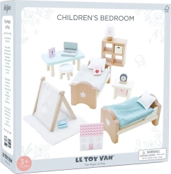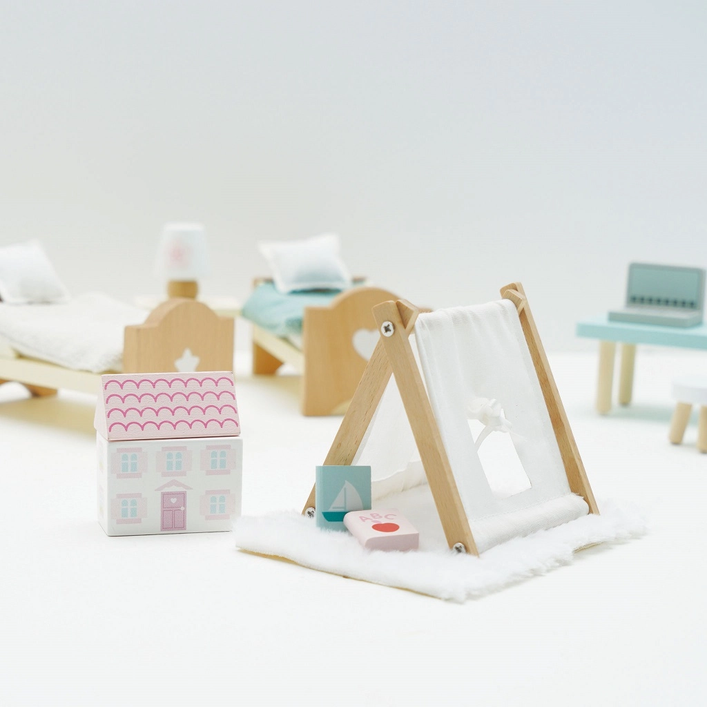 Šis elegantais 24 daļu bērnistabas komplekts lellēm ietver gultas ar spilveniem un segām, naktsgaldiņu ar lampiņu, krēsliņu, paklāju un dekorācijas, kas piešķir realistisku izskatu. Koka detaļas un maigas pasteļkrāsas sniedz stila un elegances pieskārienu. Izgatavots ētiski no ilgtspējīgiem materiāliem un krāsots ar netoksiskām, uz ūdens bāzes veidotām krāsām.