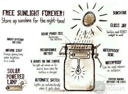 Lampa izmanto vāciņā iebūvētu saules paneli uzlādei dienas laikā, nodrošinot videi draudzīgu vakara apgaismojumu.