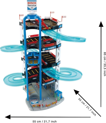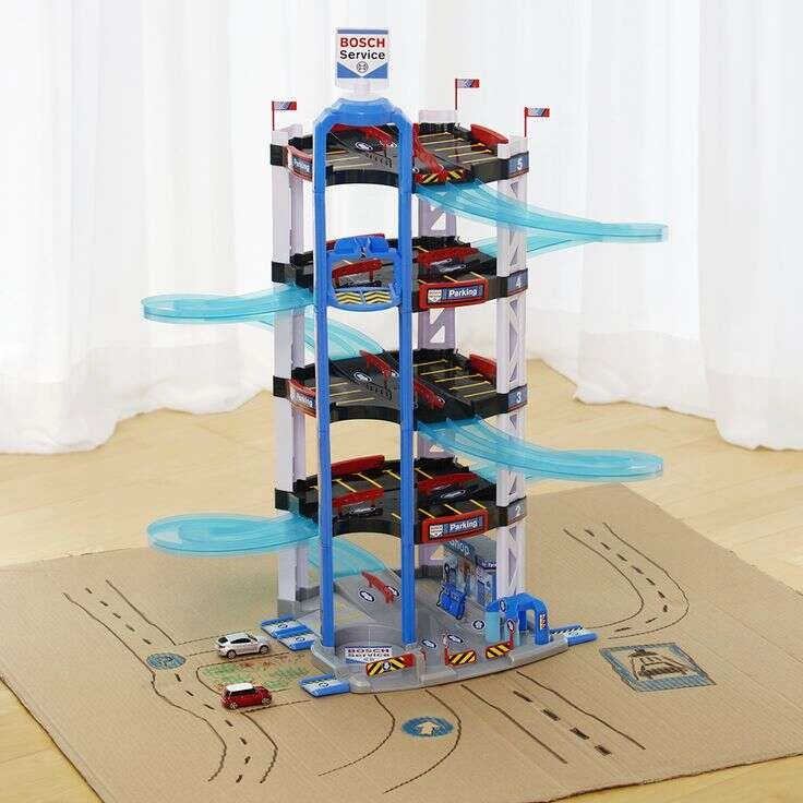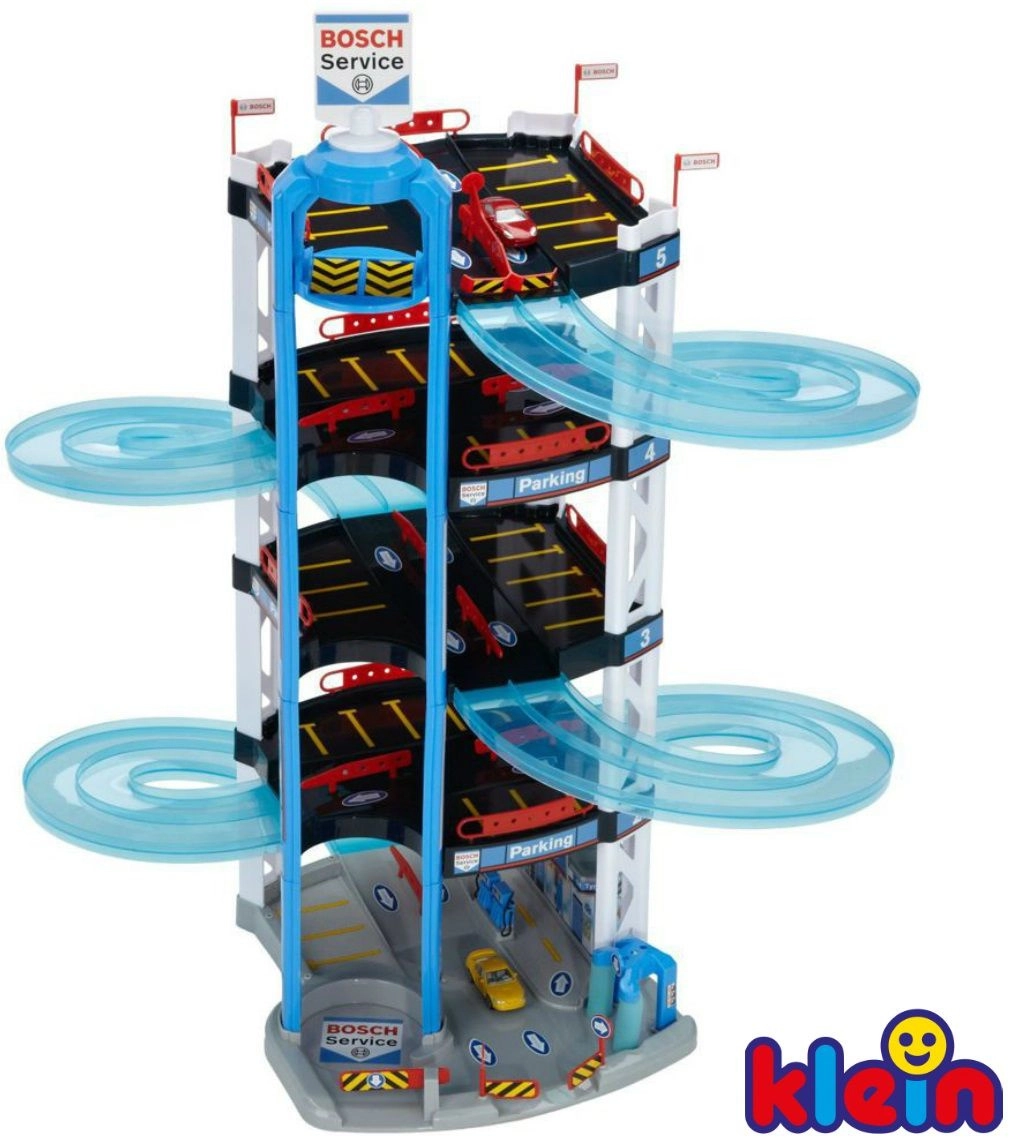 Šis izturīgais 5 stāvu BOSCH Service garāžas stāvvietas komplekss no Klein radīts mazajiem braucējiem. Tas piedāvā puscaurspīdīgas dubultas spirālveida rampas no augšējā stāva līdz lejai, manuāli vadāmu liftu mašīnīšu pārvietošanai starp stāviem un sacīkšu starta/finiša zonu divām mašīnītēm. Katrā līmenī ir pietiekami daudz stāvvietu, bet pirmajā stāvā papildus servisa zona ar “staciju” realistiskai spēlei.