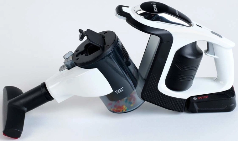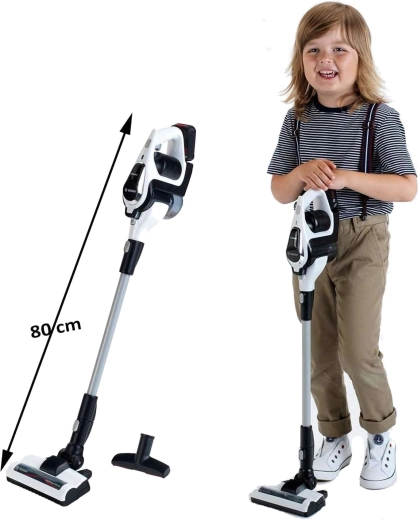 Komplektā ir atverama netīrumu tvertne vienkāršai izbēršanai, plats grīdas birstes uzgalis ar rotējošu veltni un šaura sprausla detalizētai tīrīšanai. Stieni var viegli noņemt un putekļsūcēju lietot kā kompaktā rokas ierīci – ideāli drupačām un ātrai uzkopšanai rotaļu laikā.