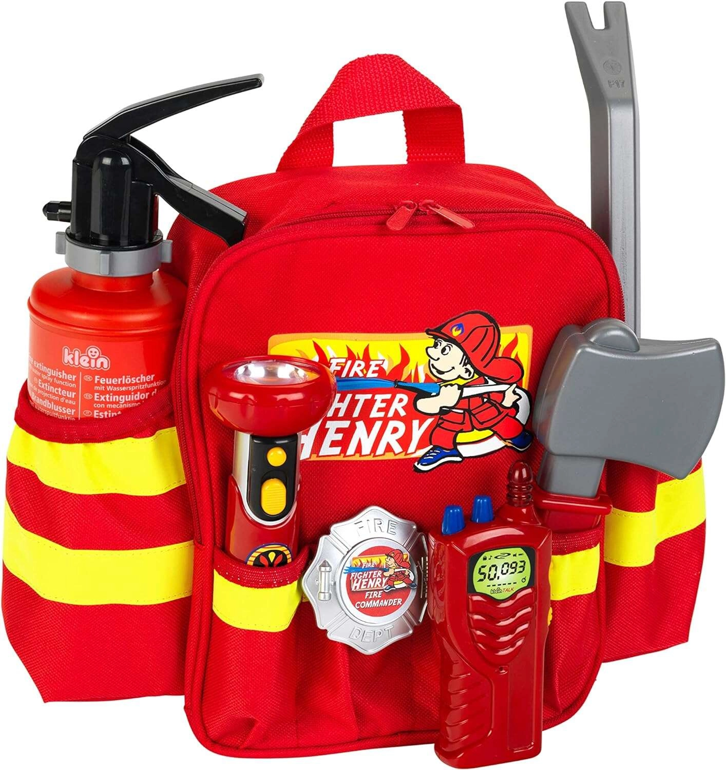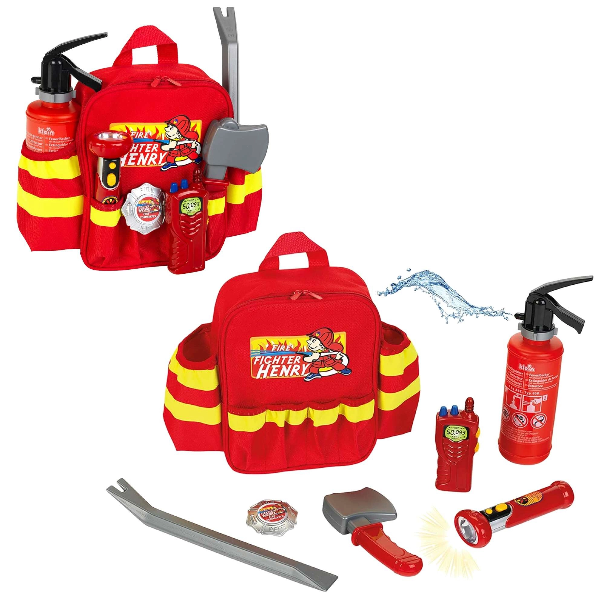 Sarkanais bērnu ugunsdzēsēju komplekts no zīmola KLEIN piedāvā visu reālistiskai ugunsdzēsēju spēlei: mugursomu ar atstarojošām svītrām, ūdens ugunsdzēšamo aparātu, spīdošu lukturīti, nozīmīti, cirvīti, laužni un rāciju. Pateicoties regulējamām siksnām un vieglai konstrukcijai, tas ir ideāli piemērots pirmsskolas vecuma bērniem un veicina iztēli, lomu spēles un drošu izklaidi.