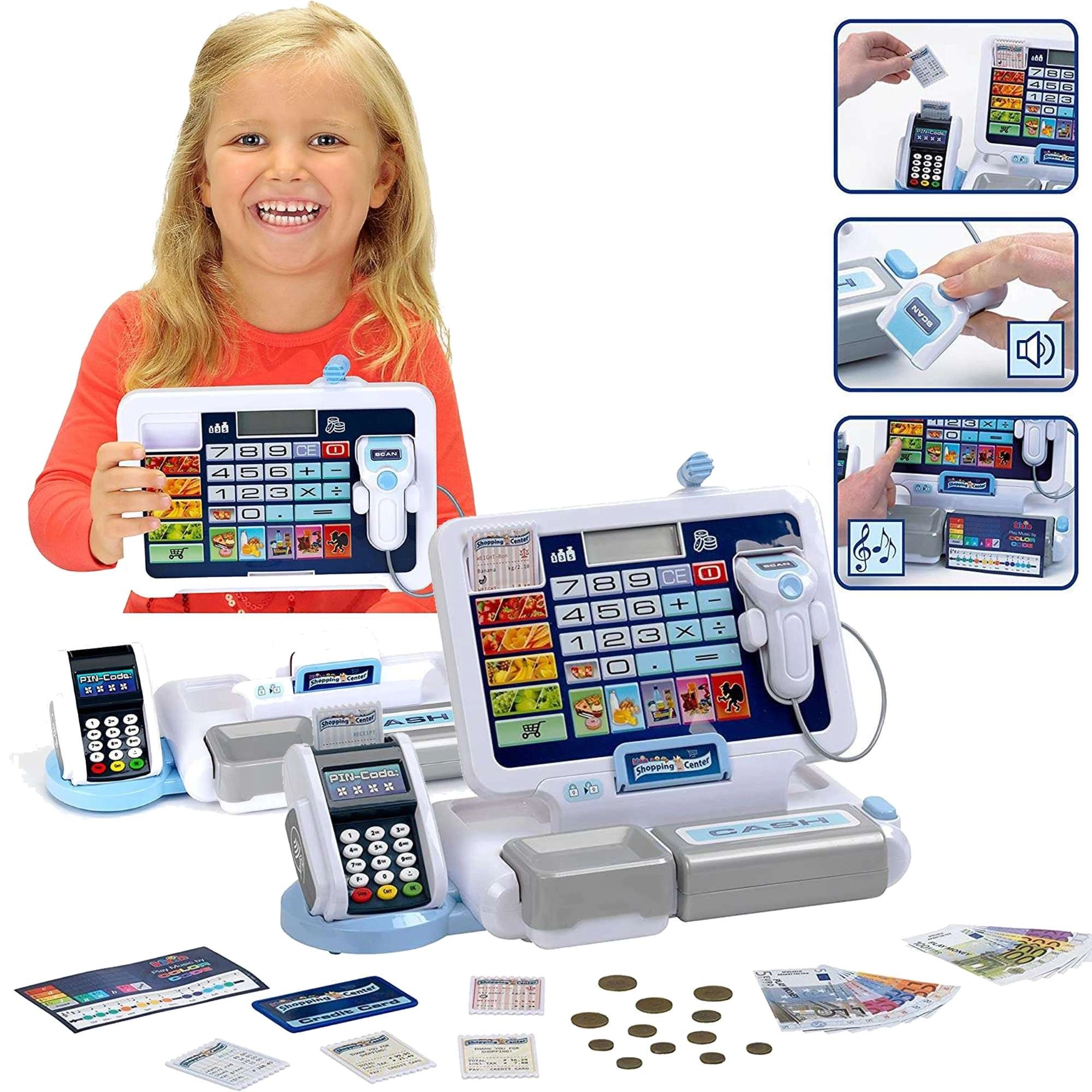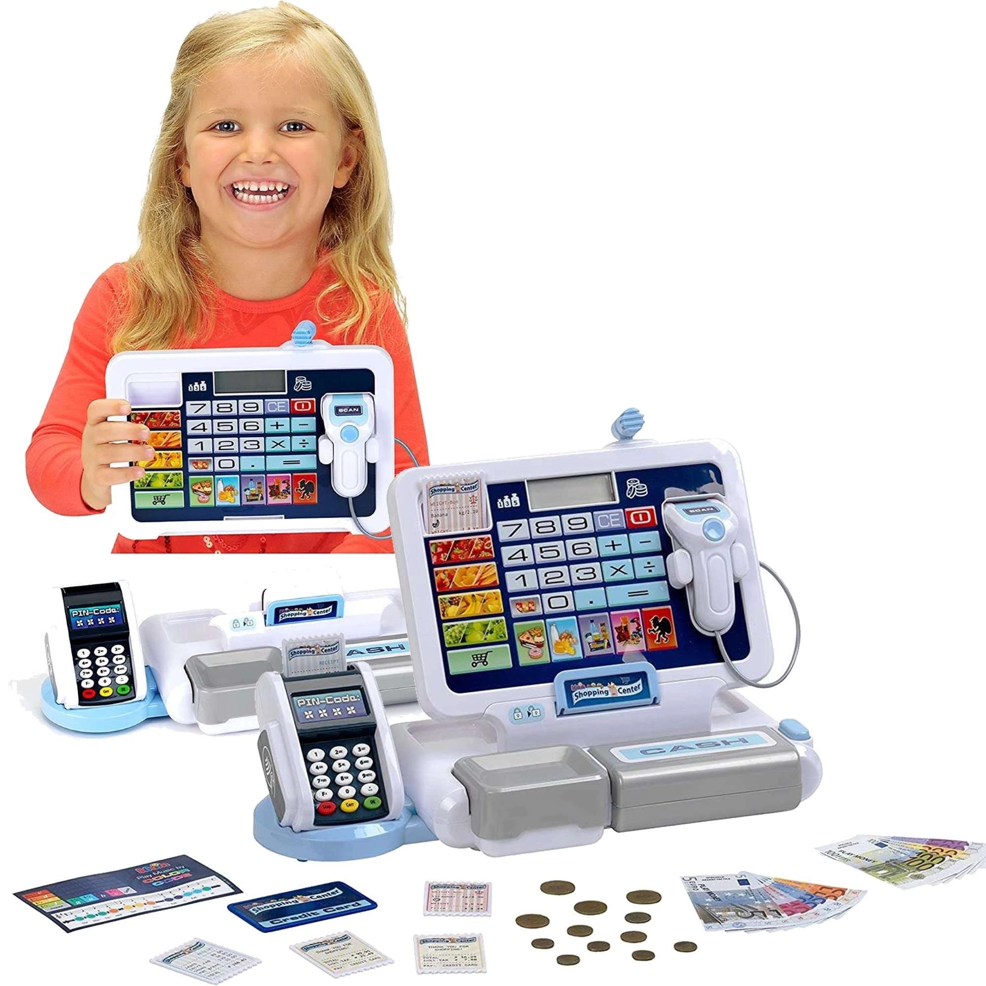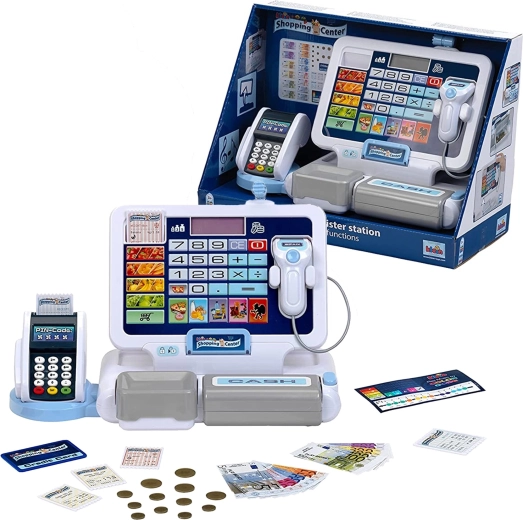 Reālistiska bērnu kase ar termināli un skeneri no zīmola KLEIN piedāvā autentisku veikala spēli. Tā piedāvā funkcionālu displeju ar kalkulatoru, atveramu naudas atvilktni, karšu lasītāju, skaņas efektus un bagātīgu piederumu komplektu, tostarp eiro monētas un banknotes, čekus un “kredītkarti” – ideāli piemērota skaitīšanas, finanšu pratības un lomu spēļu attīstīšanai.