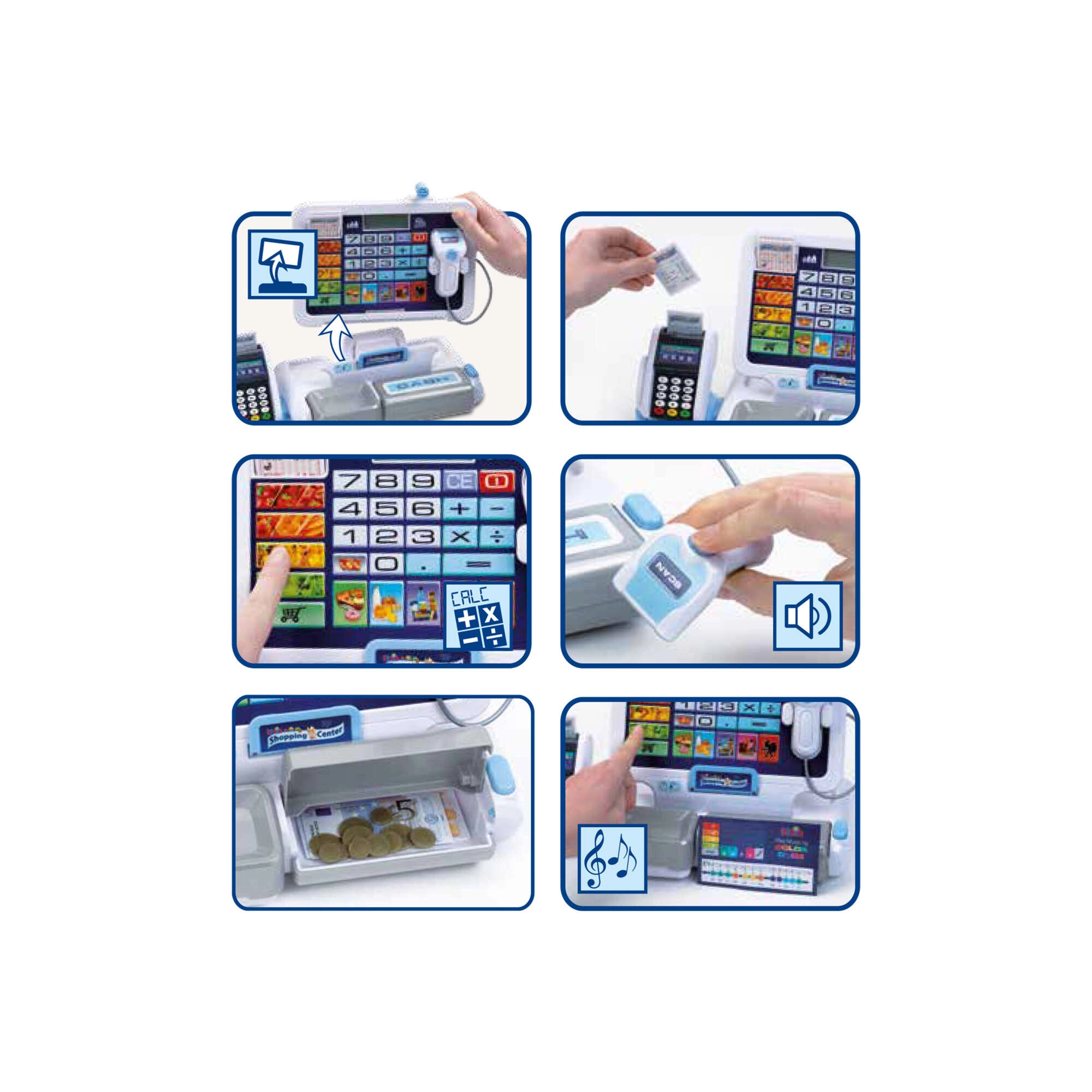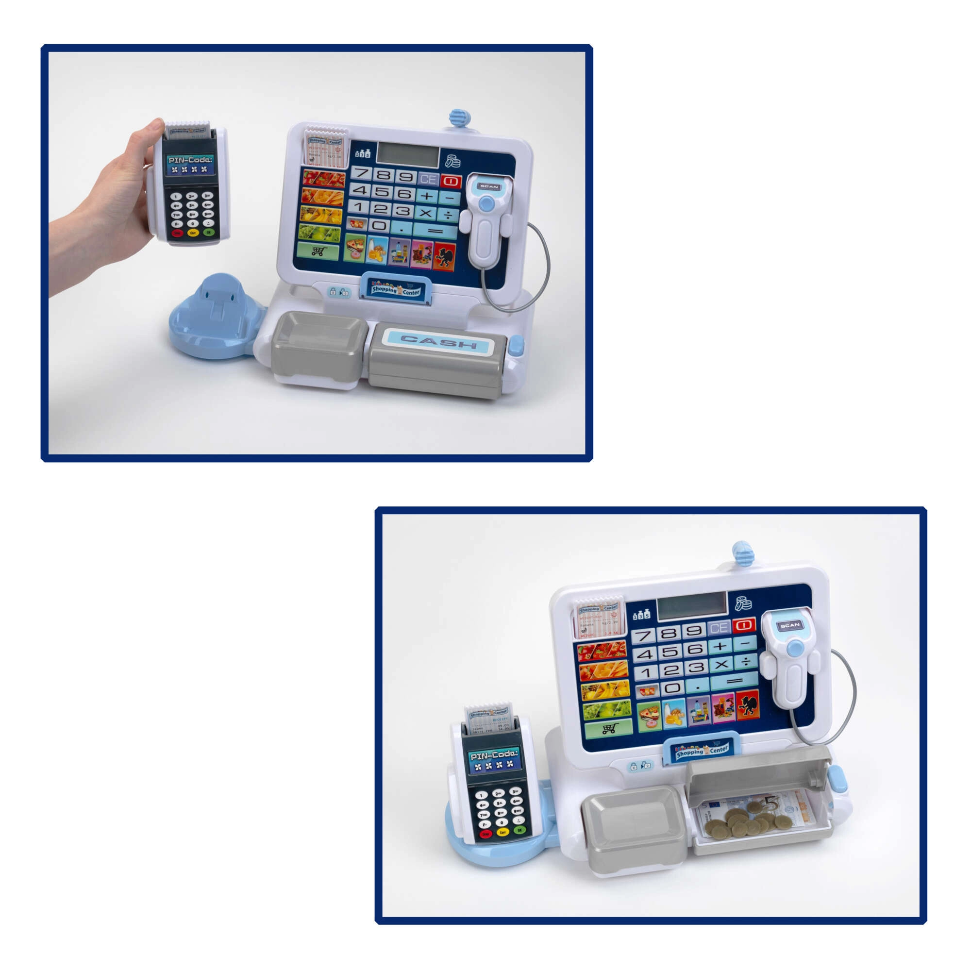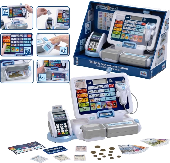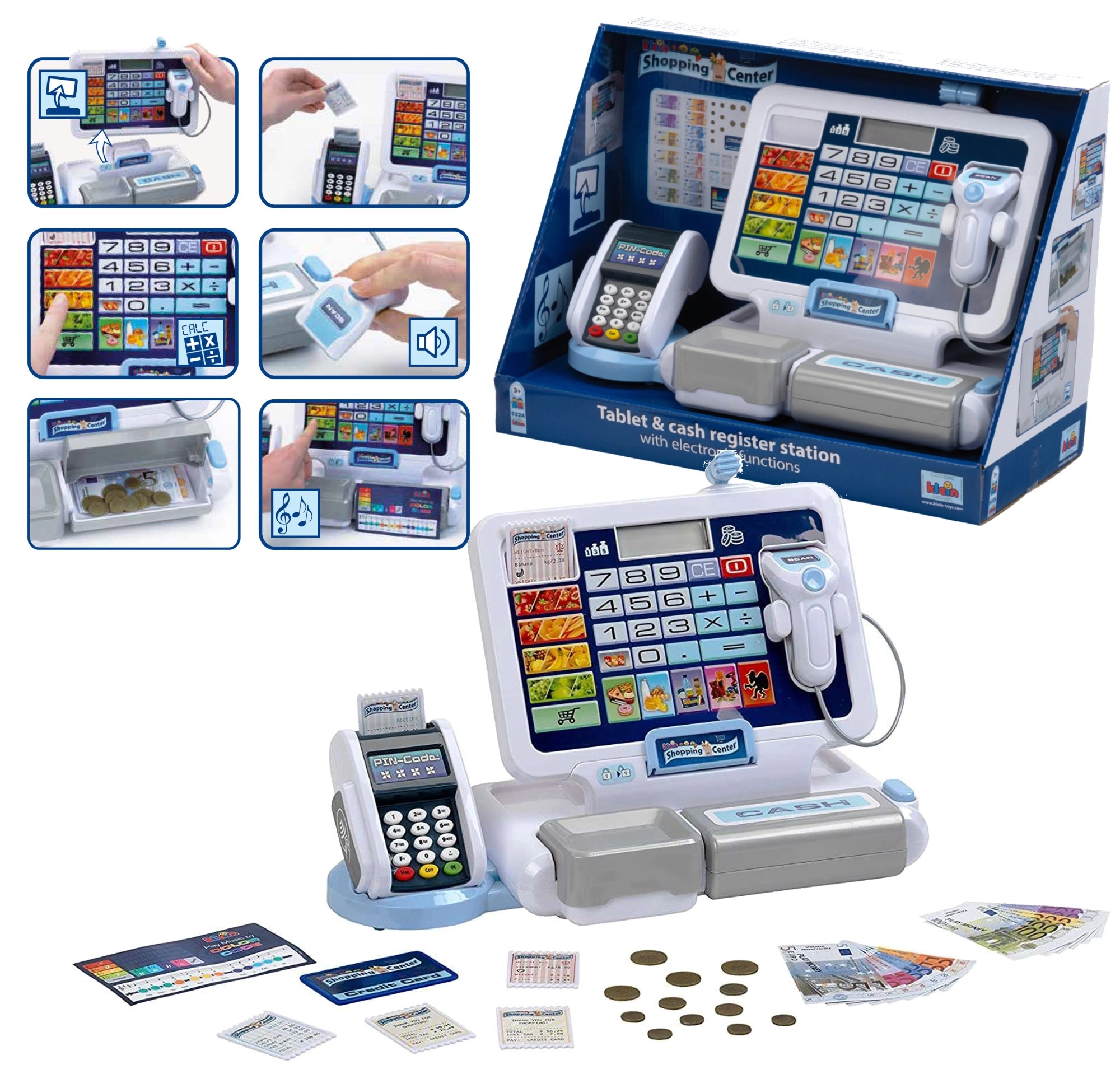 Elektroniskā bērnu kase atdarina īstu kasi: tai ir pārskatāms displejs ar kalkulatoru, karšu lasītājs, skeneris un izkrītoša skaidras naudas atvilktne ar pazīstamu “klikšķi”. Bērni var “noskanēt” preces, ievadīt cenas un ļaut kasei visu automātiski saskaitīt. Pelēki baltā krāsu salikums izskatās moderni un tīri.