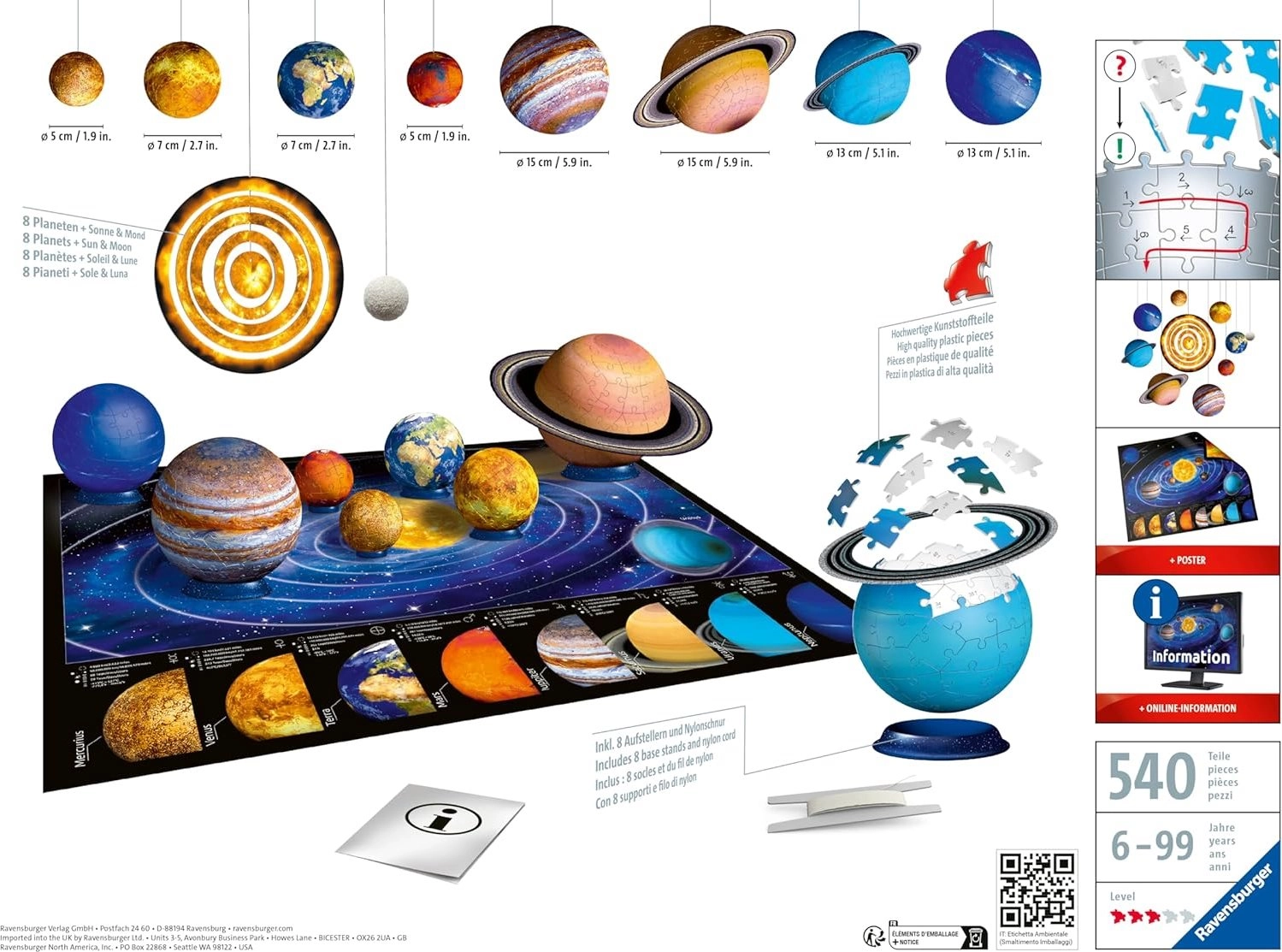 Pateicoties RAVENSBURGER augstajai kvalitātei, salikšana ir plūstoša, aizraujoša un izglītojoša. Gatavās planētas varat piekarināt vai izvietot uz statīviem un izveidot iespaidīgu kosmosa modeli mājās. Komplektā ir arī divpusējs plakāts ar informāciju (paraksti svešvalodā) un ilustrēta instrukcija vieglam sākumam.