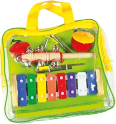 Atklājiet mūzikas pasauli ar Bino mūzikas komplektu! Šis četru instrumentu komplekts ir ideāli piemērots mazajiem mūziķiem, lai attīstītu muzikālo talantu, dzirdi un ritma izjūtu. Komplektā iekļauts ksilofons, kastiņetes, triangls un zvārguļi, viss ērtā somiņā vieglai pārnēsāšanai.