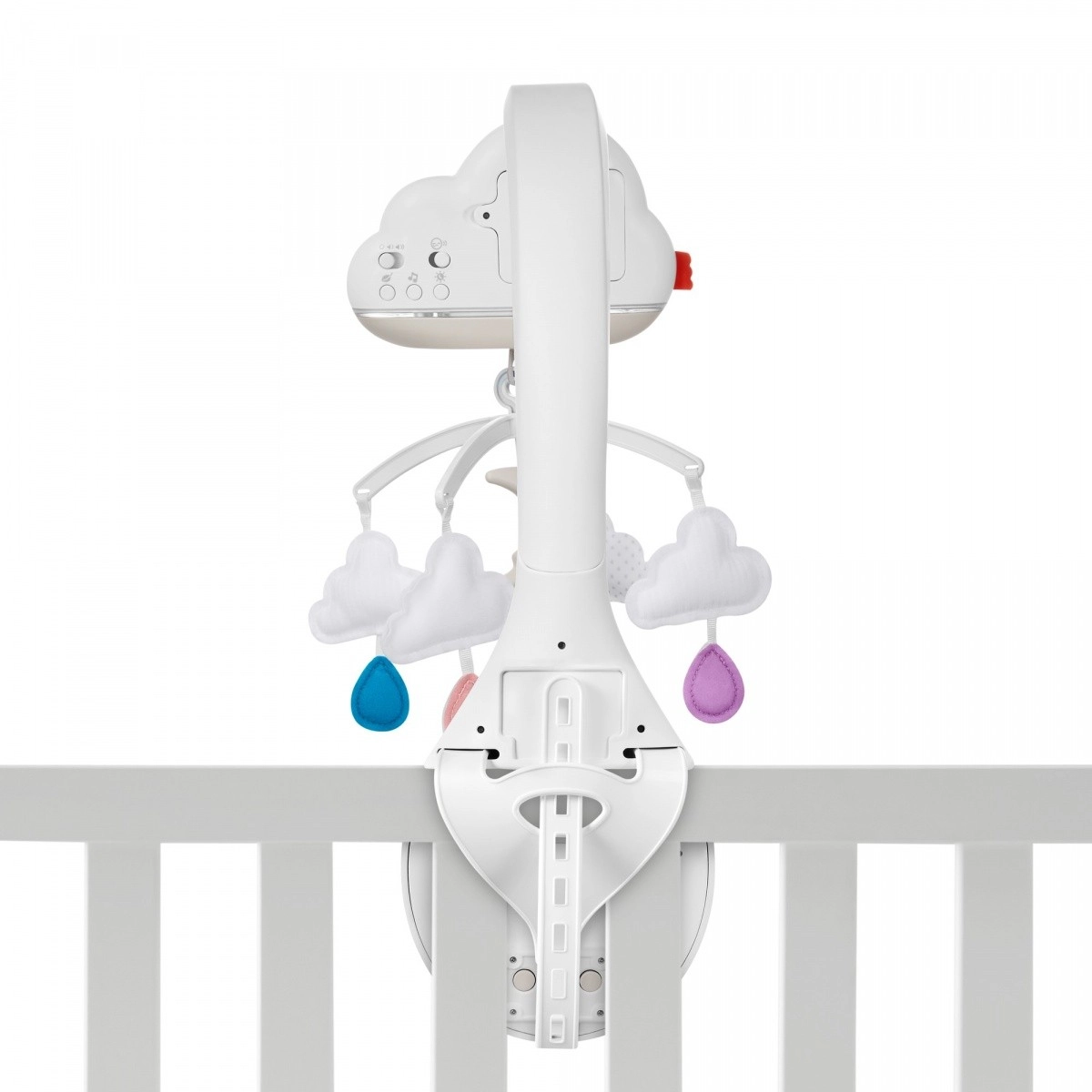 Calming Cloudsdaa karuselis un iemidzinoabjs no Fisher Price nodroaina jabusa baerna miera miegu ar kustababu, maziku, skaaam un gaismaam. Ar skaaas sensoru tas automaatiski atkal aktivizaajas, kad baerns izdod skaaanu.