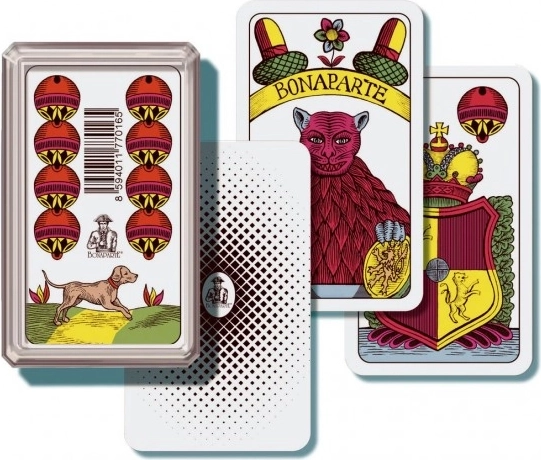 Tradicionālās viengalvainās Mariāša kārtis ērtā plastmasas kastītē, ideālas jebkurai situācijai.