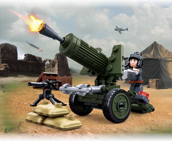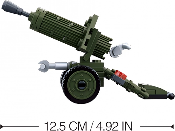 Uzbūvē detalizētu zaļu lielgabalu uz riteņiem ar ieročiem, kasti un “smilšu” maisiem autentiskai kaujas atmosfērai.