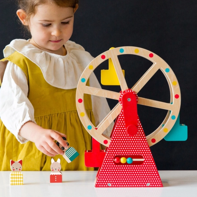 Izbaudiet stundām ilgu izklaidi ar skaisti veidoto koka panorāmas ratu no PETIT COLLAGE. Pagrieziet rokturi un vērojiet, kā lielais ritenis griežas, vizinot trīs mīļus dzīvnieku draugus no dižskābarža koka, vienlaikus attīstot sīko motoriku un koordināciju. Izturīgā konstrukcija ir krāsota ar netoksiskām, uz ūdens bāzes veidotām krāsām un lieliski papildinās jebkuru bērnistabu.
