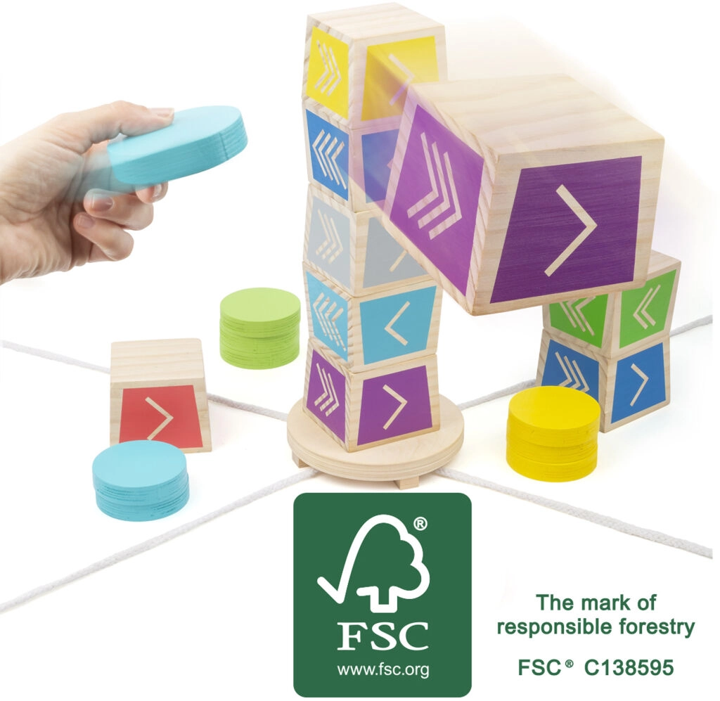 Ģimenes āra spēle no 100% FSC koka 2–4 spēlētājiem, iedvesmota no Kubb stila. Mērķis ir nogāzt augšējo kubu no torņa, izmantojot krāsainus diskus – trenē metiena precizitāti, koordināciju un telpisko uztveri. Ideāli bērniem no 5 gadu vecuma un godīgai sacensībai dārzā vai parkā.