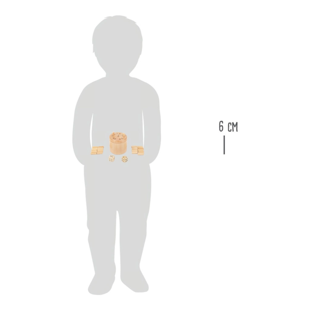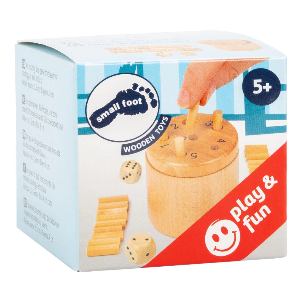 Pēc spēles visas kociņus un kauliņus ērti ievietosiet koka cilindrā. Nekādu pazudušu detaļu – spēle vienmēr gatava līdzi ņemšanai.