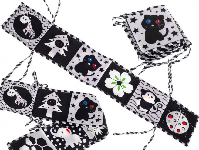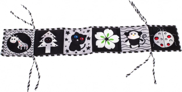 Kontrasta senzomotorā grāmatiņa, kas izstrādāta kā gultiņas aizsargs, ir lieliska izvēle bērniem, kuri sāk atklāt pasauli. Grāmata harmonikas formā var tikt viegli piestiprināta pie gultiņas ar aukliņu palīdzību, nodrošinot ne tikai izklaidi, bet arī drošību.