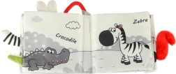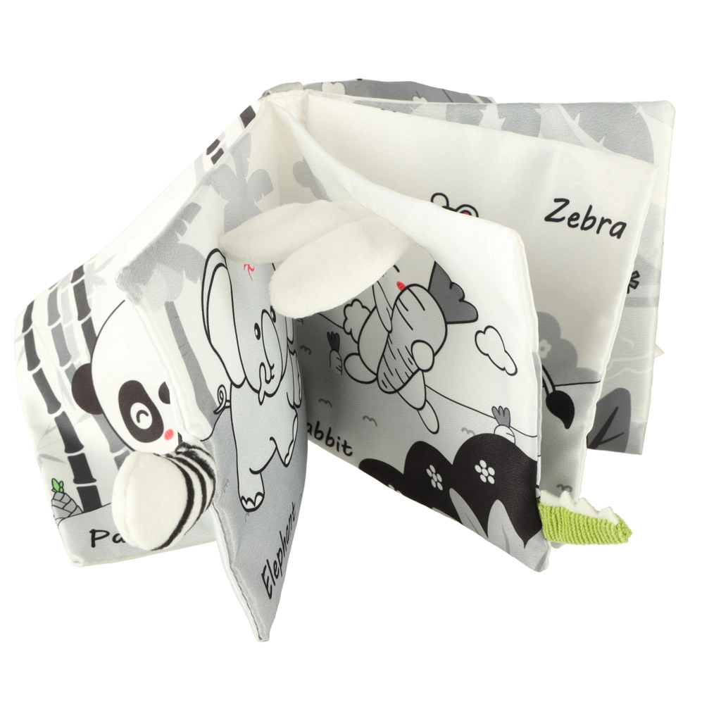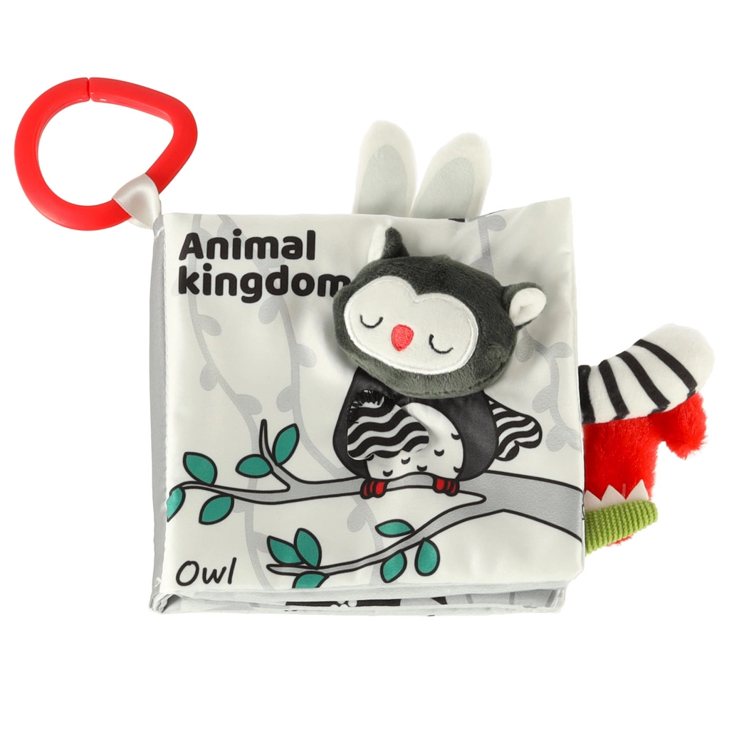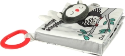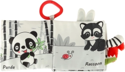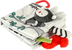 Ar šo mīksto grāmatiņu kontrastainās krāsās jūsu mazulis dosies atklāt dzīvnieku pasauli – no pūces līdz pērtiķītim un pandai, kā arī jenotam, zilonim, krokodilam un zebrai. Melnbaltie un sarkanie elementi veicina agrīnu vizuālo stimulāciju, bet dažādās tekstūras un interaktīvie elementi attīsta sīko motoriku un roku–acs koordināciju. Katrā lapā ir dzīvnieku nosaukumi angļu valodā, kas dabiski palīdz pirmajiem vārdiem.