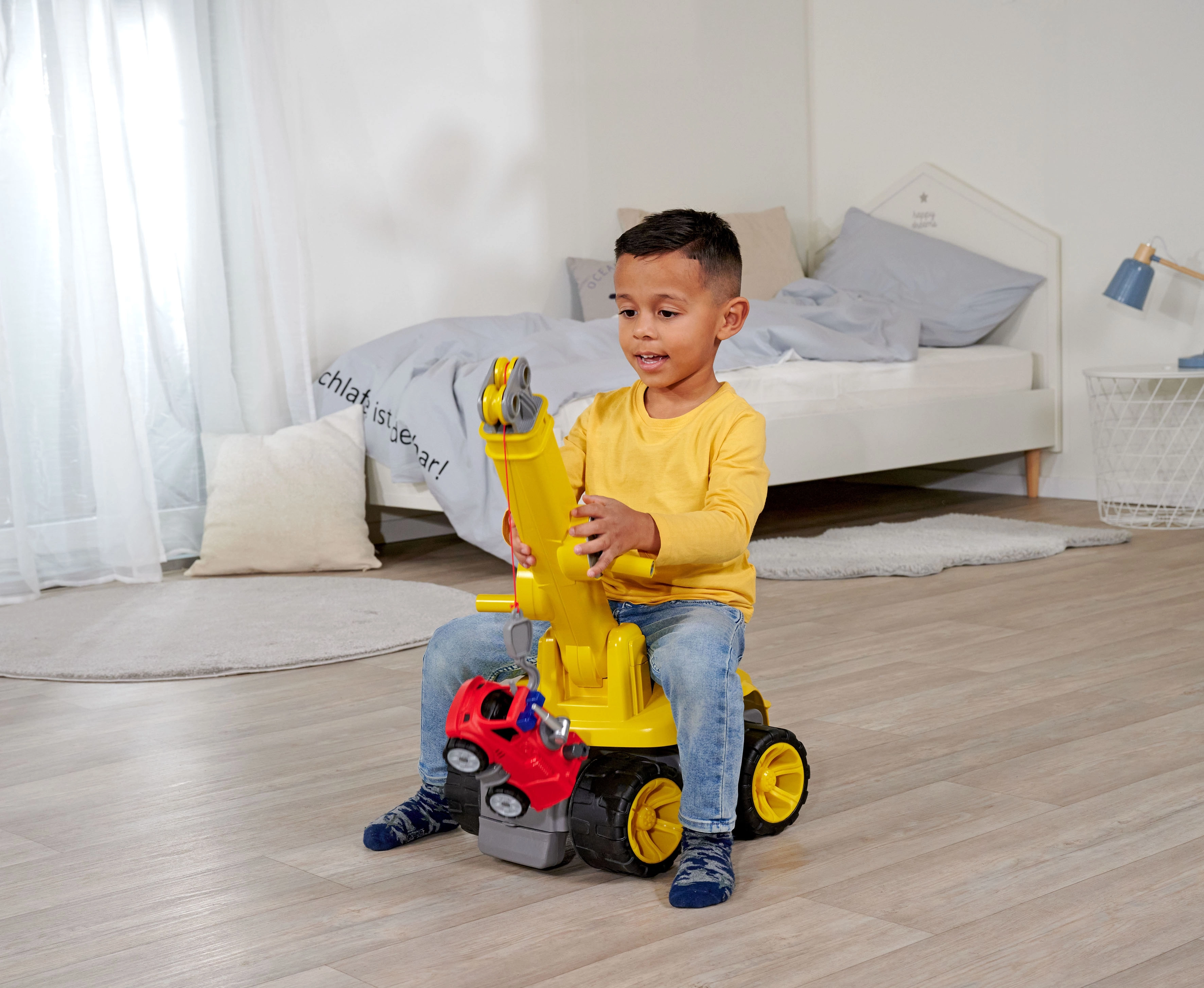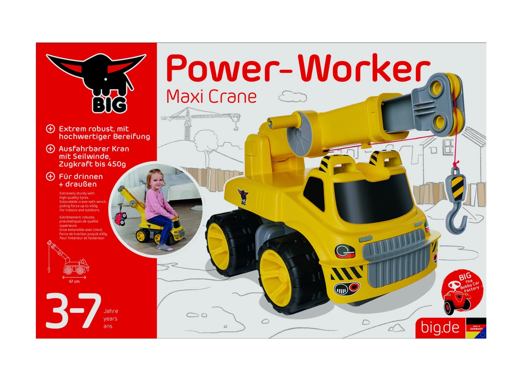 BIG Power Worker maxi celtņu auto ir stabils līdzsvara braucamais no kvalitatīvas, robustas plastmasas, izstrādāts ilgam kalpošanas laikam un drošai izklaidei. Celtņa tornis griežas par 360°, bet kustīgā strēle viegli vadāma, lai bērni varētu celt un pārvietot priekšmetus ar jaudīgo troses vinču, kuras vilkmes spēks ir līdz 450 g.