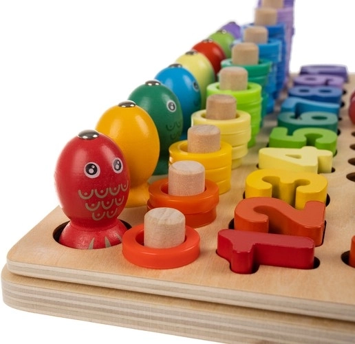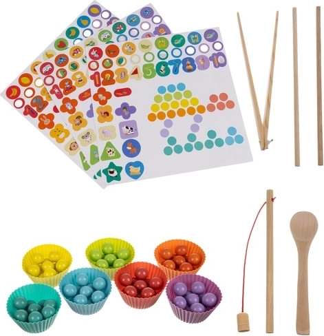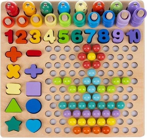 Šis visaptverošais koka izglītojošais komplekts apvieno mozaīku ar krellēm, figūru veidošanu un magnētisko makšķerēšanu. Spēlējoties bērni vingrina skaitīšanu, krāsu šķirošanu un formu atpazīšanu, vienlaikus attīstot smalko motoriku un satvērienu, izmantojot pinceti, kociņus un karotīti. Piemērots patstāvīgai spēlei un kopīgām mācībām ar vecākiem.