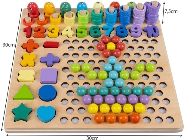 Komplektā ir abpusēji paraugi, cipari, matemātiskie simboli un krāsaini riņķi un lodītes rakstu veidošanai. Pateicoties koka pamatnei, rotaļlieta ir izturīga un stabila, košās krāsas iedvesmo radošumu un bērns viegli apgūst matemātikas pamatus.