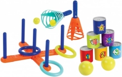 Izbaudiet izklaidi ar 3 vienā spēļu komplektu, kas ietver trīs iecienītas spēles telpām un āra aktivitātēm: noķer bumbiņu, riņķu mešana uz krusta un bundžu gāšana. Ražots Francijā no izturīgas plastmasas.