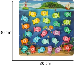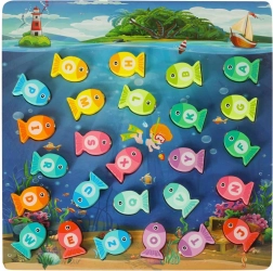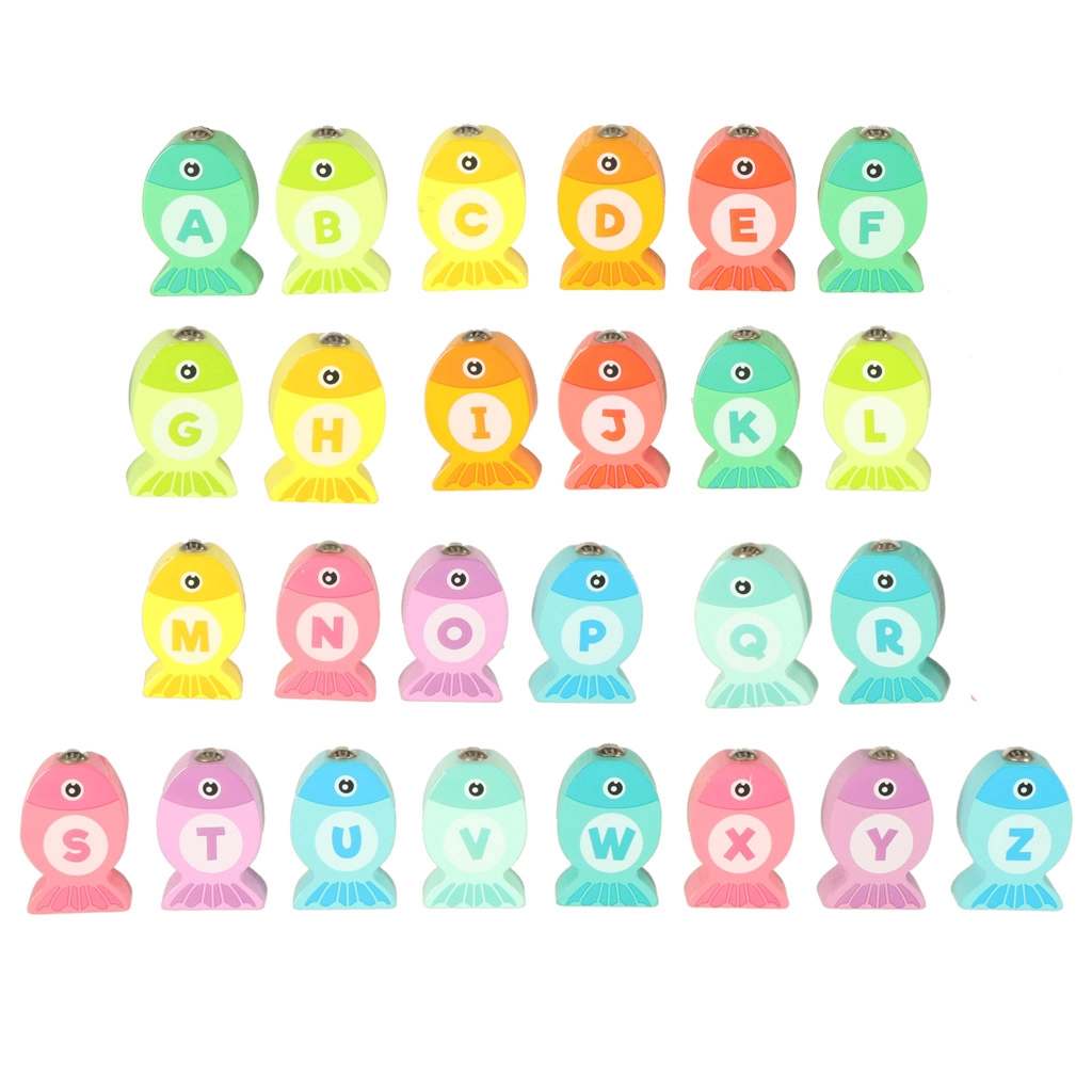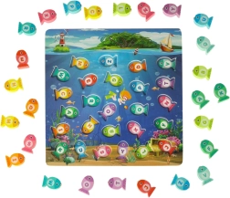Pievienojieties burvīgajai zemūdens pasaulei un baudiet bezgalīgu izklaidi ar koka zivtiņu makšķerēšanas spēli. Šī izglītojošā spēle palīdz bērniem apgūt burtiņus, krāsas un skaitīšanu. Ar burtiem apzīmētās zivtiņas jāievieto atbilstošajos atvērumos, un tās var arī noķert ar magnētisko makšķeri. Viss process palīdz attīstīt koncentrēšanos un pacietību.