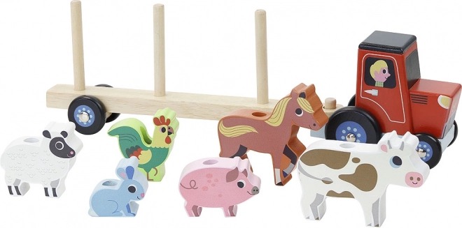 Jautrs VILAC koka traktors ar noņemamu piekabi un sešiem mīlīgiem dzīvniekiem (zaķis, aita, gailis, zirgs, cūka, govs) ir lieliska rotaļlieta bērniem no 2 gadu vecuma. Pateicoties figūriņu uzlikšanai un braukšanai ar piekabi, bērni attīsta acs–rokas koordināciju, pacietību un iztēli.