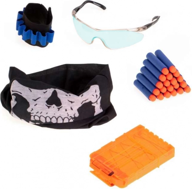 Komplets bērniem spēlēm ar putu bultām: ērta taktiskā veste ar stiprinājumiem un kabatām, 20 putu bultas, plastmasas aptvere 6 bultām, aproces siksna munīcijai, aizsargbrilles zilā krāsā un bandana. Vestei ir elpojošs siets, universāls bērnu izmērs un regulējams līplentes aizdare ērtai valkāšanai.