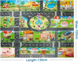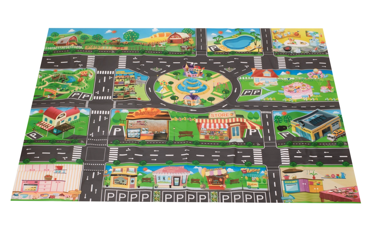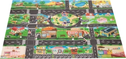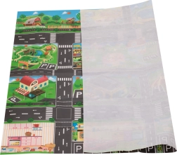 Liels ūdensnecaurlaidīgs paklājs bērniem ar pilsētas apdruku ir ideāli piemērots radošām rotaļām. Tas izgatavots no plastmasas, kas atgādina vaskadrānu, tādēļ to ir viegli kopt un tīrīt. Nelielais svars un salokāmība ļauj to ērti pārnēsāt un izmantot arī ārpus mājas, piemēram, piknikā.