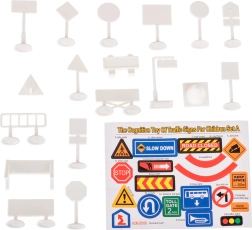 Komplektā iekļautas ceļa zīmes, kas palīdz bērniem rotaļu veidā apgūt satiksmes drošības pamatnoteikumus.