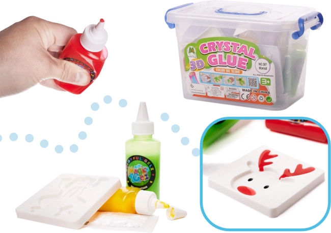 Radošais komplekts ar kristālisku 3D gēlu pārvērš bērnu un pieaugušo idejas košās, elastīgās figūrās. Iepakojumā atradīsiet 8 krāsainus gēlus, 10 formas, trauciņu un 6 maisiņus ar cietinātāju – viss ievietots praktiskā kastē. Vienkārša lietošana, radošuma un sīkās motorikas attīstīšana, daudz izklaides un oriģinālas dekorācijas.