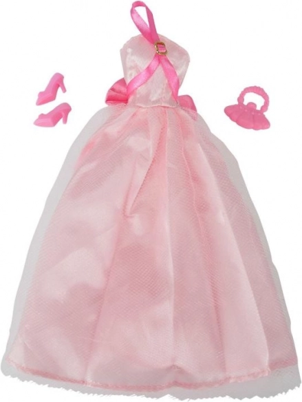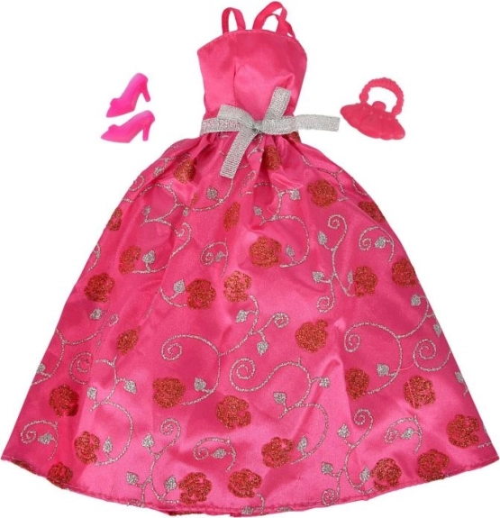 Kleitai pievienotas saskaņotas augstpapēžu kurpes un somiņa, kas papildina eleganto komplektu lellēm.