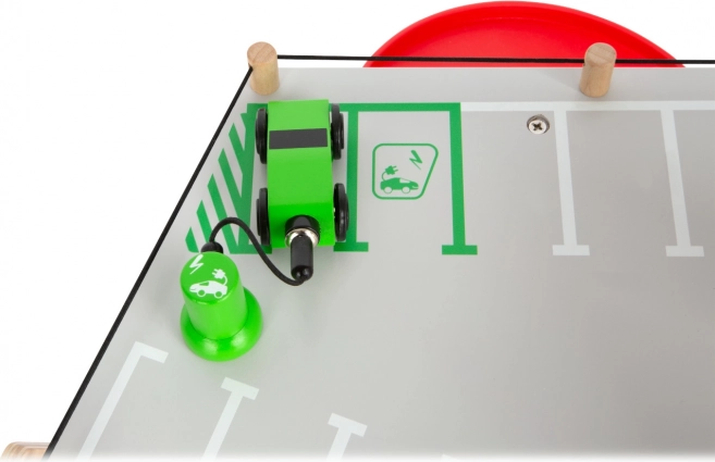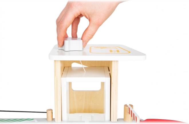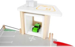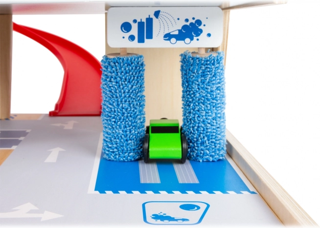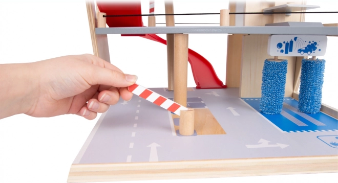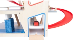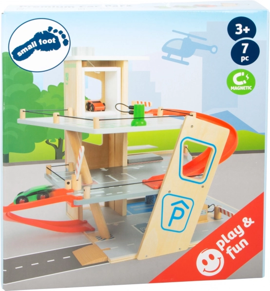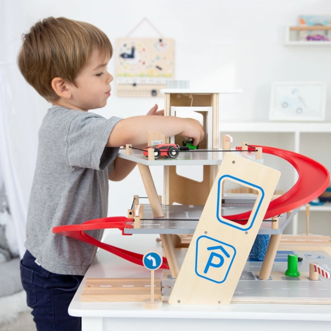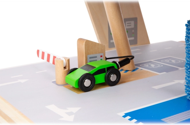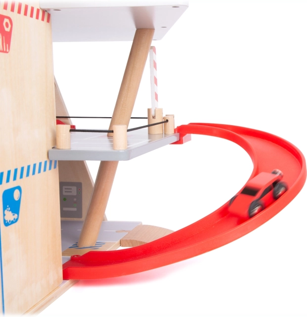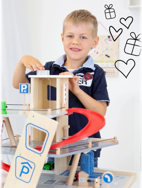 Atklājiet izturīgu koka autostāvvietu ar trim stāviem, funkcionālu liftu un plūdenām rampām bezgalīgām spēlēm ar mašīnītēm. Komplektā ir divas mašīnas, degvielas uzpildes stacija, uzlādes ierīce elektroauto, paceļamā rampa, reālistiska automazgātava ar birstēm un mehāniskie šlagbaumi katrā stāvā. Drošu braucienu nodrošina gumijas norobežojumi, bet detalizētais marķējums veicina satiksmes apziņas attīstību.