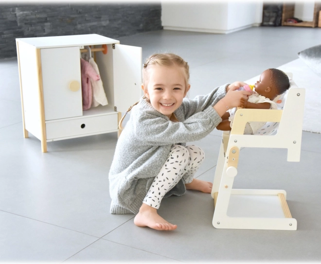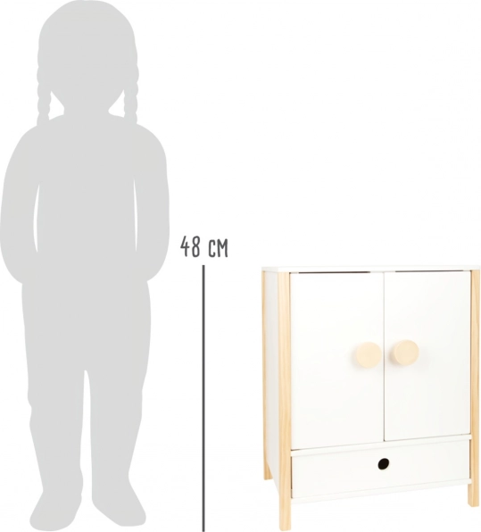 Izturīga koka konstrukcija, stabils izpildījums un drošas, noapaļotas malas nodrošina ērtu un drošu rotaļāšanos. Skapītis veicina patstāvību, kārtības izjūtu un attīsta iztēli, spēlējoties par rūpēm par lellēm.