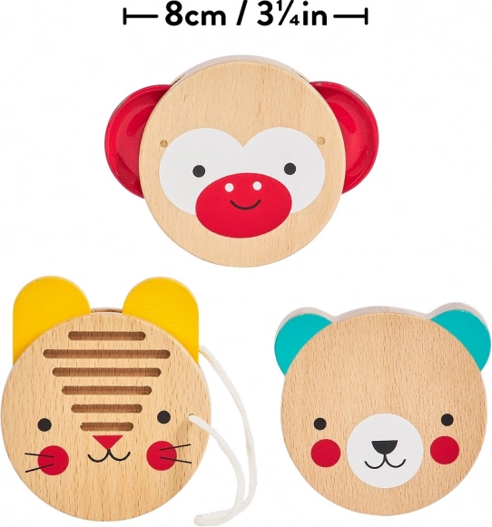 Trīs vienkārši perkusiju instrumenti ar dzīvnieku motīviem veicina dabisku ritma izjūtu un prieku par muzicēšanu jau agrā vecumā.