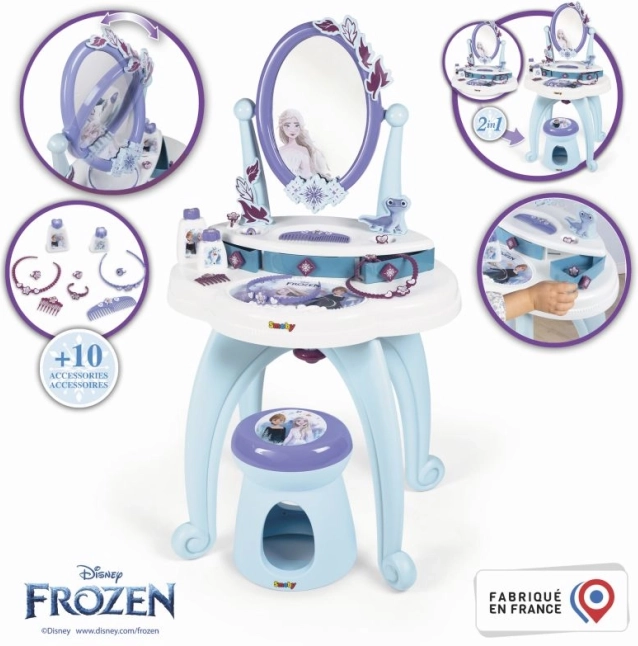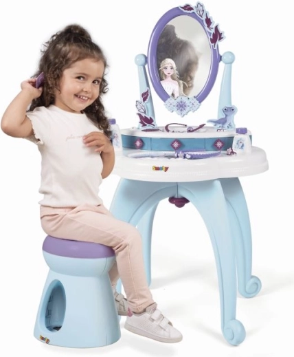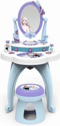Tualetes galds 2 vienā, iedvesmots no Ledus karaļvalsts, piedāvā visu, kas mazajām princesēm nepieciešams ikdienas kopšanai. Tas ietver lielu rotējošu spoguli un bagātīgu piederumu komplektu, piemēram, smaržas un citus kosmētikas aksesuārus.