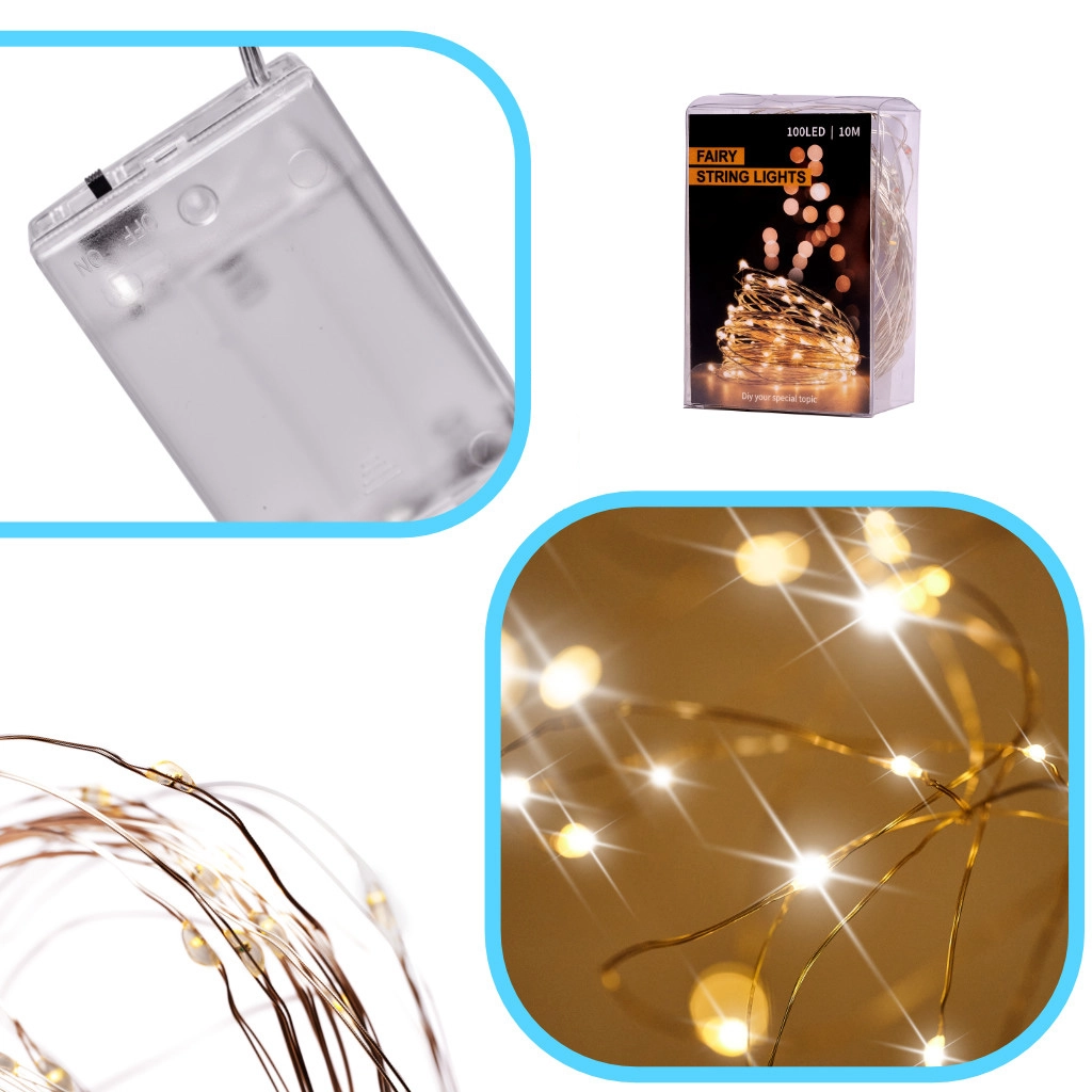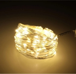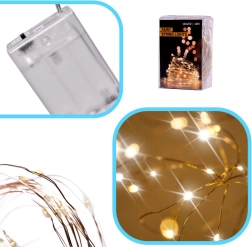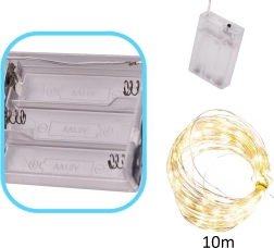 Maigs, silti balts mirdzums burvīgai atmosfērai mājās un Ziemassvētku laikā. 10 metri elastīgas stieplītes ar 100 LED, kas darbināmas ar baterijām, viegli paslēpsiet zaru dekorācijās, burkās vai citās kompozīcijās un izveidosiet romantisku, mājīgu apgaismojumu jebkur bez rozetes.