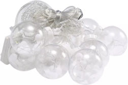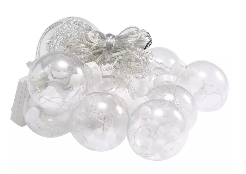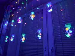 Piekaramais gaismas aizkars ar plastmasas bumbiņām pārvērtīs jūsu interjeru gleznainā ziemas ainavā.