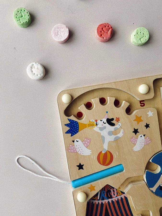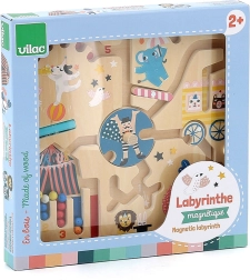 Magnētiskais labirints VILAC iepazīstina bērnus no 2 gadu vecuma ar cirka pasauli maigās Michelle Carlslund krāsās. Ar magnētisku burvju pildspalvu viņi virza bumbiņas pa trasēm, satiekas ar akrobātiem, dzīvniekiem un klauniem, un beigās atgriež katru bumbiņu pareizajā vietā pēc krāsas un skaitļa. Spēle dabiski attīsta koncentrēšanos un pacietību.