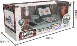Komplektā ietilpst kase ar svariem, terminālis, kalkulators, skeneris un daudzi piederumi, tostarp rotaļu viedtālrunis un dažādi plastmasas pārtikas produkti.