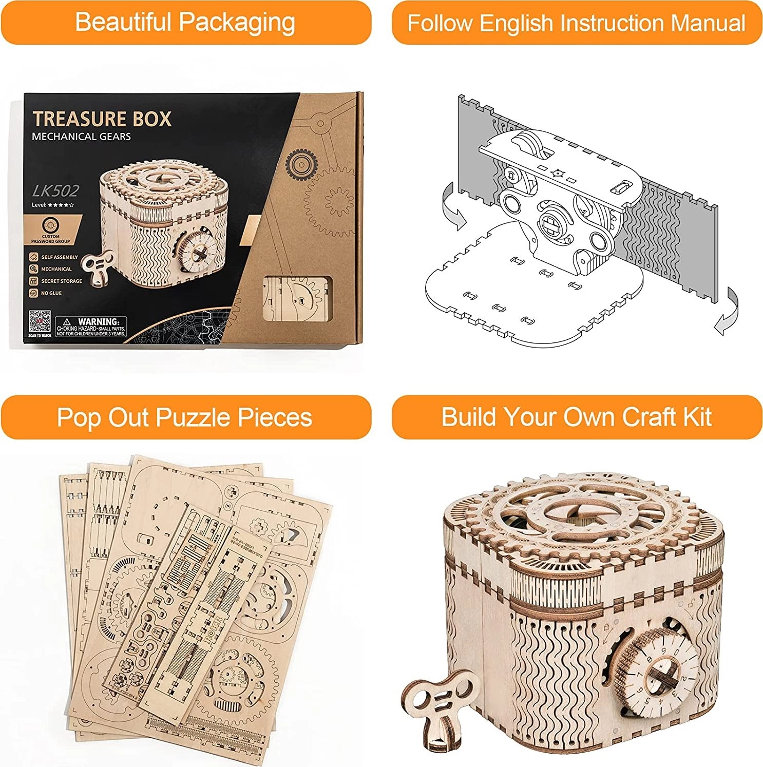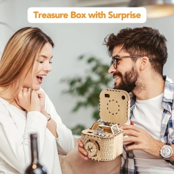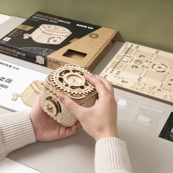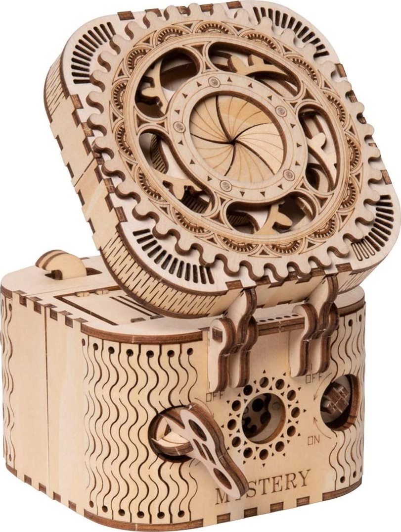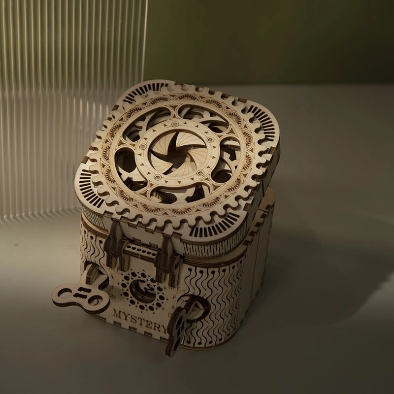 Koka mehānisko pužļu rotaslietu kārbiņa no saplākšņa ir unikāla dāvana DIY entuziastiem un grezna interjera dekorācija. Salikšana ir vidējas grūtības un sniedz lielisku izaicinājumu ar 123 precīzi izgrieztām detaļām. Kārbiņai ir divi nodalījumi, tostarp galvenais, kas ir nodrošināts ar trīsciparu kodu, ko lietotājs var iestatīt no daudzām kombinācijām.