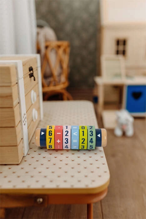 Atklājiet aizraujošu ceļu uz matemātiku. Koka veltnis ar sešiem rotējošiem gredzeniem ļauj bērniem veidot gan vienkāršus, gan sarežģītākus vienādojumus un skaitļu salīdzinājumus. Pateicoties spilgtām krāsām un izteiksmīgiem cipariem, bērni mācās rotaļīgi, vienlaikus attīstot sīko motoriku un koncentrēšanos.