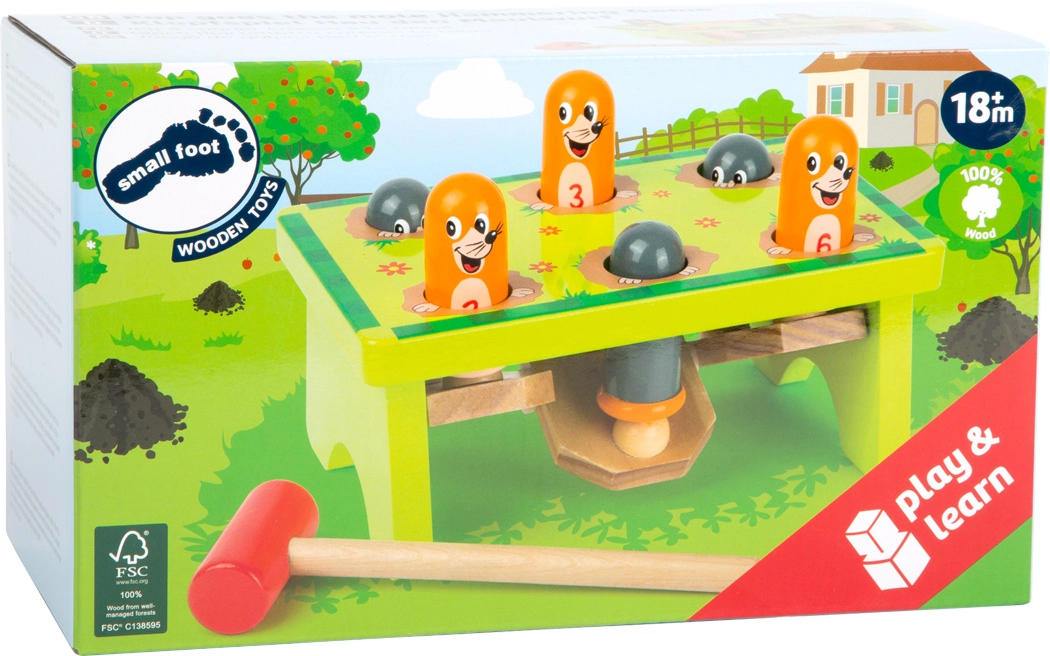 Šī koka sitamā spēle no SMALL FOOT pārvērš ikdienu jautrā kurmīšu medībās dārzā. Bērni ar koka āmuriņu sit pa kurmīšiem un vēro, kā tie ar prieku parādās citā caurumā. Vienkāršais princips veicina koncentrēšanos un sniedz atkārtotu izklaidi.