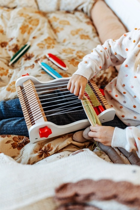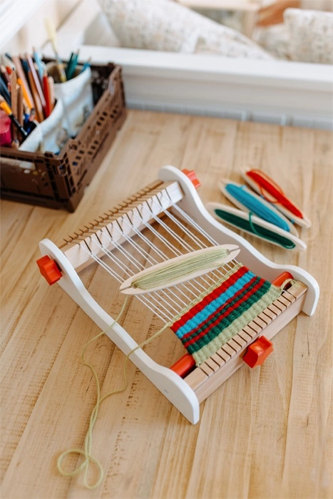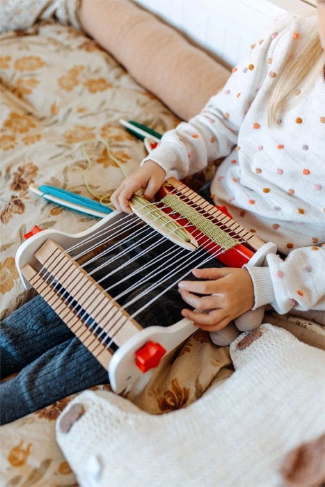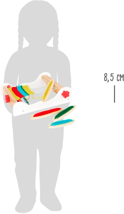 Kompakta galda konstrukcija ar pārskatāmu šķēru vadību un vienkāršu audu ievēršanu bērniem atvieglo aušanas pamatu izpratni jau no pirmā mēģinājuma.