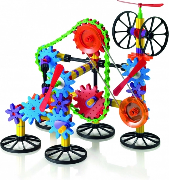 Krāsainie elementi, stieņi, riteņi un pārnesumi ļauj veidot gan vienkāršus, gan sarežģītus modeļus. Iztēlei nav robežu.