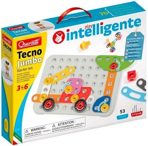 Konstruktors Quercetti Tecno Jumbo ir ideāls bērniem vecumā no 3 līdz 6 gadiem, kuri vēlas attīstīt savu radošumu un sīko motoriku. Komplektā ir 52 dažādu krāsu plastmasas detaļas, tostarp skrūves, uzgriežņi un citi elementi dažādu struktūru veidošanai.