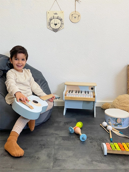 Sāciet mājas koncertus ar šīm stilīgajām bērnu bungām! Pateicoties regulējamai kokvilnas siksnai, klusām vālītēm ar skaņu slāpējošiem uzgaļiem un izturīgai koka konstrukcijai, tās ir ideāli piemērotas pirmajiem soļiem mūzikas pasaulē. Attīsta ritma izjūtu, roku–acu koordināciju un sīko motoriku, turklāt lieliski izskatās bērnistabā.