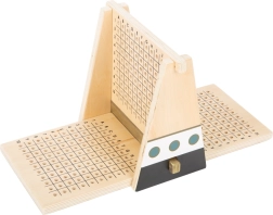 Meklējiet pretinieka kuģus un sargājiet savu floti modernajā koka versijā spēlei Kuģi. Centrālā siena nodrošina izvietojuma privātumu un pārskatāmu trāpījumu un garāmejienu atzīmēšanu – zilie karodziņi kuģu apkārtnei, baltie tiešiem trāpījumiem. Pateicoties magnētiem rāmī, visa konstrukcija ir stingra un stabila, tāpēc viss paliek savā vietā pat saspringtu cīņu laikā.