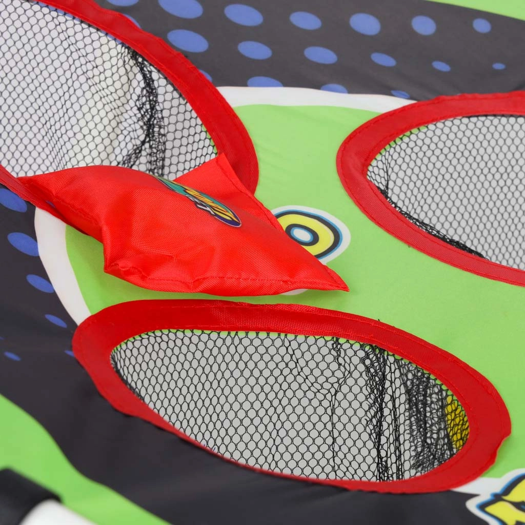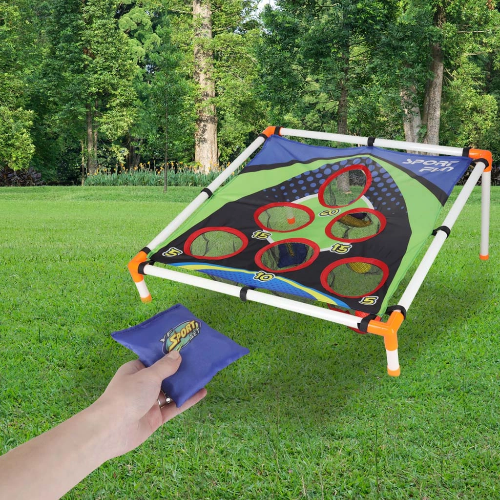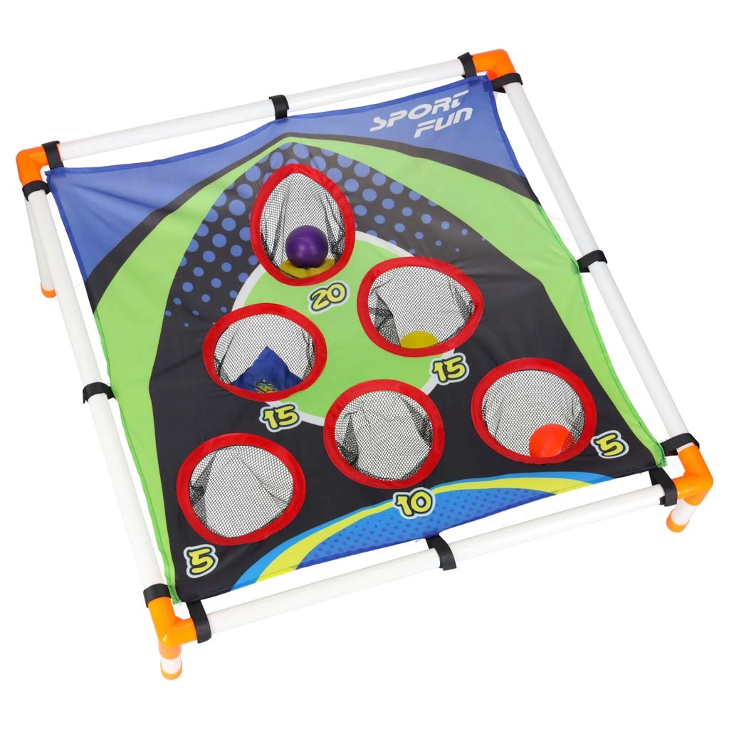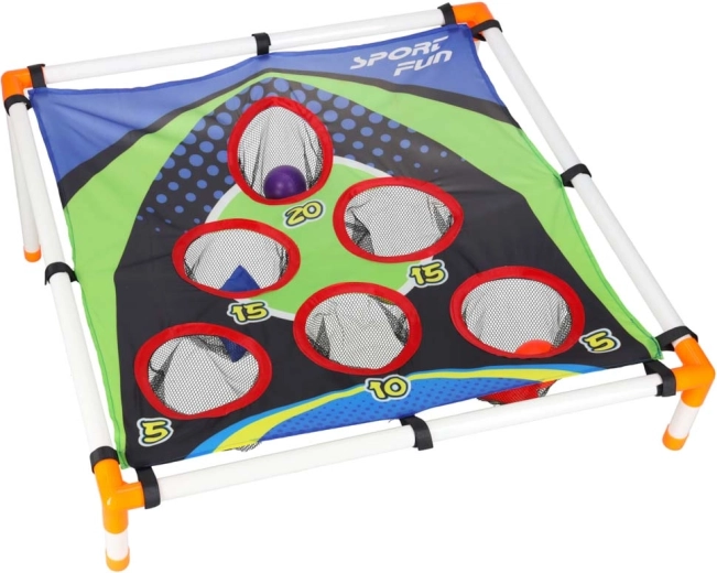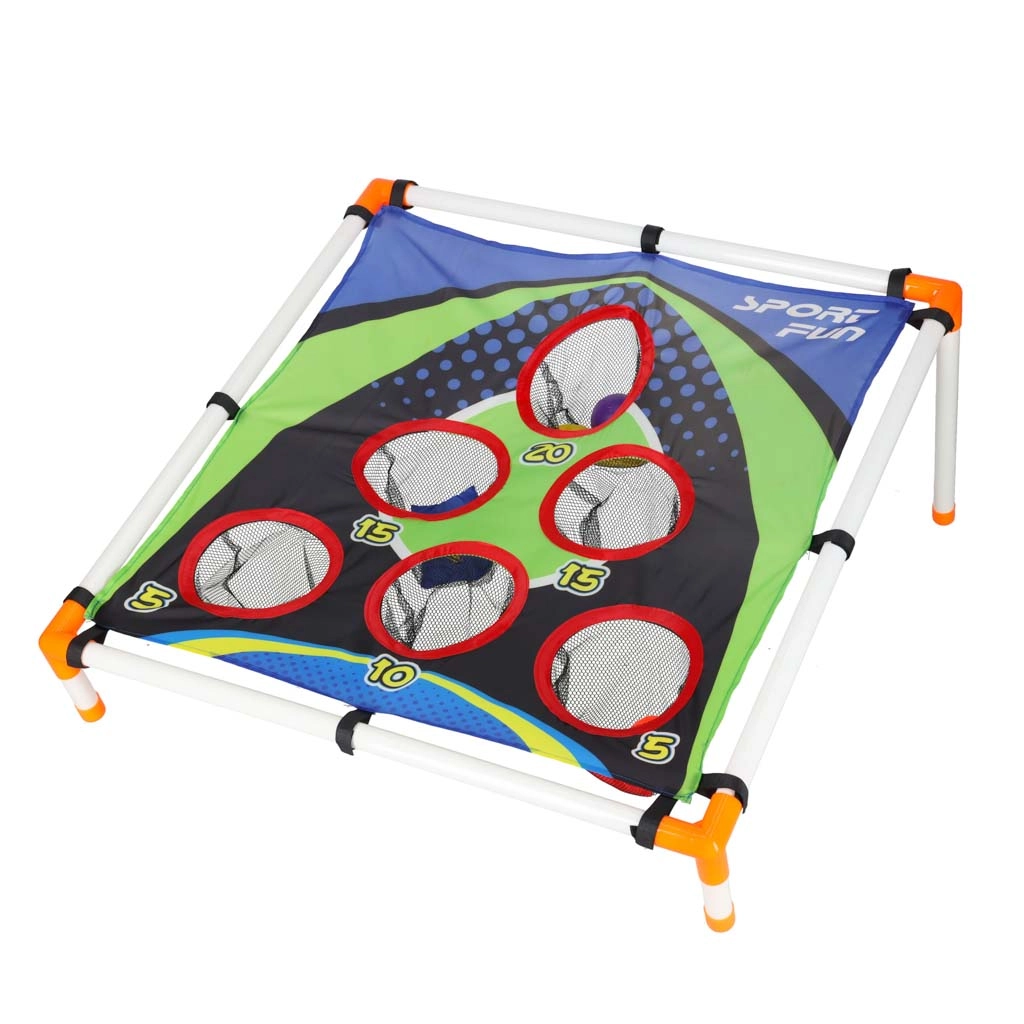 Izklaidējoša mešanas spēle bērniem, kas attīsta acu–roku koordināciju, precizitāti un ātras reakcijas. Viegls rāmis ar slīpu mērķi un numurētām atverēm piedāvā dažādus punktu izaicinājumus. Piemērota dārzam un telpām, vienkārša salikšana un viegla pārvietošana. Komplektā ir gan mešanas maisiņi, gan plastmasas bumbiņas.