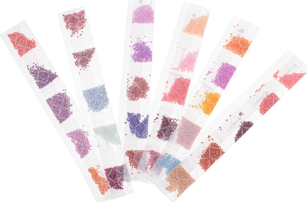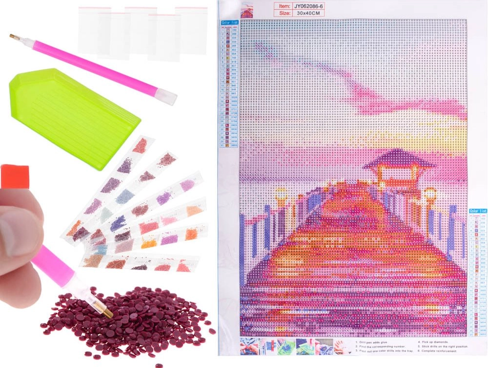 Komplektā iekļauti visi piederumi, kas nepieciešami, lai mājās ērti izveidotu unikālu dimantu gleznojumu.