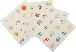 Izglītojošu kartīšu komplekts ar krāsainiem alfabēta burtiem un atbilstošām ilustrācijām. Palīdz mācīties un atpazīt alfabētu jautrā un interaktīvā veidā.