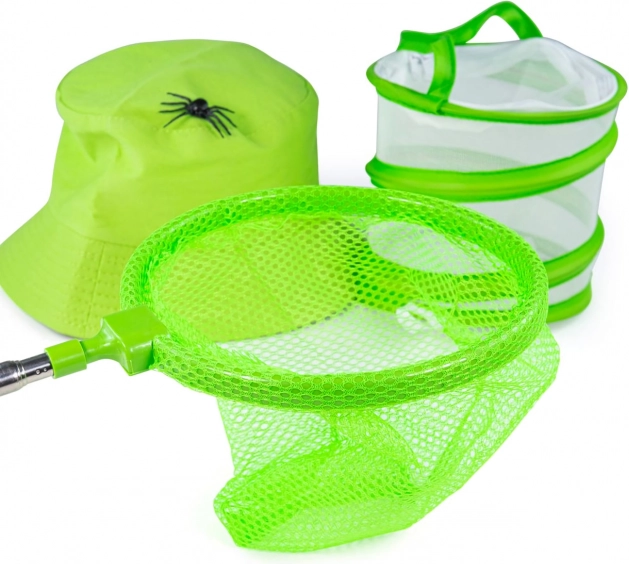 Tīkls, trauciņš ķērumiem, palielināmais stikls, ķeramās knaģītes, tālskatis un cepurīte – pilns aprīkojums drošai kukaiņu ķeršanai un dabas vērošanai.